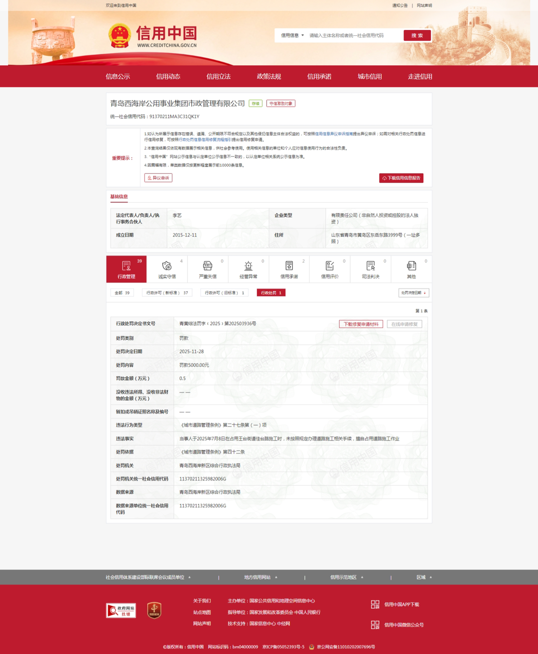 齐鲁晚报·齐鲁壹点记者于信用中国行政处罚栏获悉,11月28日,青岛西海岸公用事业集团市政管理有限公司(下称“西海岸公用集团市政公司”)因“擅自占用道路施工作业”等收到罚单,处罚机关为青岛西海岸新区综合行政执法局。