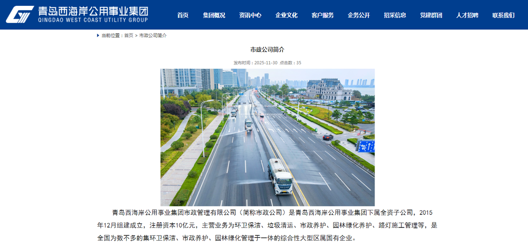 据西海岸公用集团官网介绍,西海岸公用集团市政公司是青岛西海岸公用事业集团下属全资子公司,主营业务为环卫保洁、垃圾清运、市政养护、园林绿化养护、路灯施工管理等,是全国为数不多的集环卫保洁、市政养护、园林绿化管理于一体的综合性大型区属国有企业。