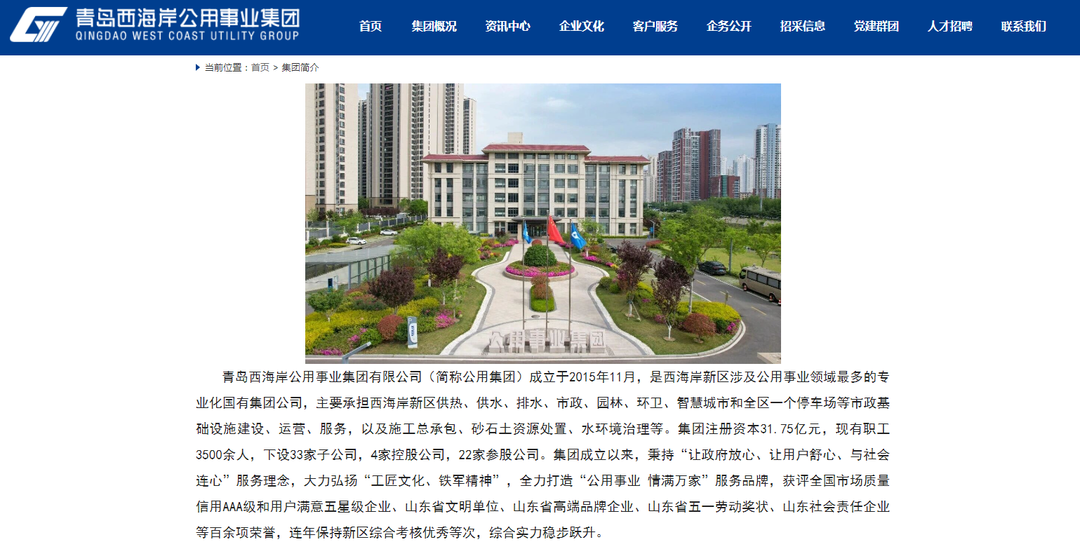 西海岸公用集团则是西海岸新区涉及公用事业领域最多的专业化国有集团公司,主要承担西海岸新区供热、供水、排水、市政、园林、环卫、智慧城市和全区一个停车场等市政基础设施建设、运营、服务,以及施工总承包、砂石土资源处置、水环境治理等。