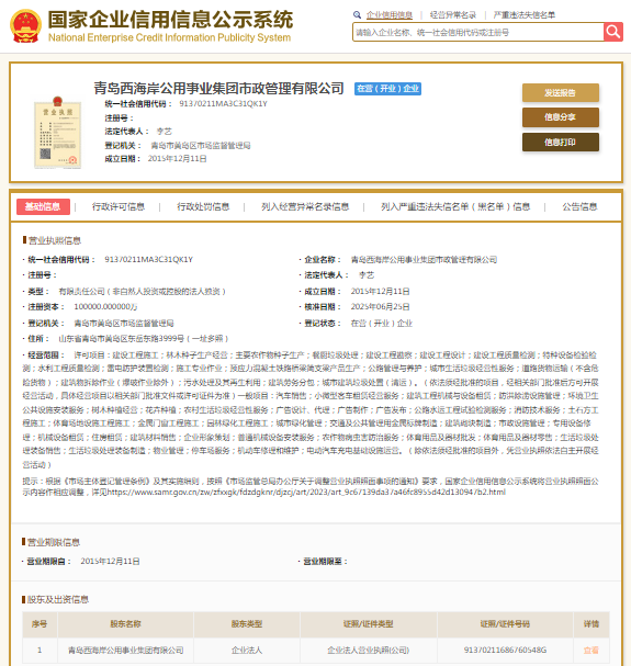 国家企业信用信息公示系统显示,青岛西海岸公用事业集团市政管理有限公司成立于2015年,注册资本100000万元人民币,法定代表人李艺,由青岛西海岸公用事业集团有限公司全资持股。青岛西海岸公用事业集团有限公司则成立于2009年,注册资本317500万元人民币,法定代表人李寿辉。