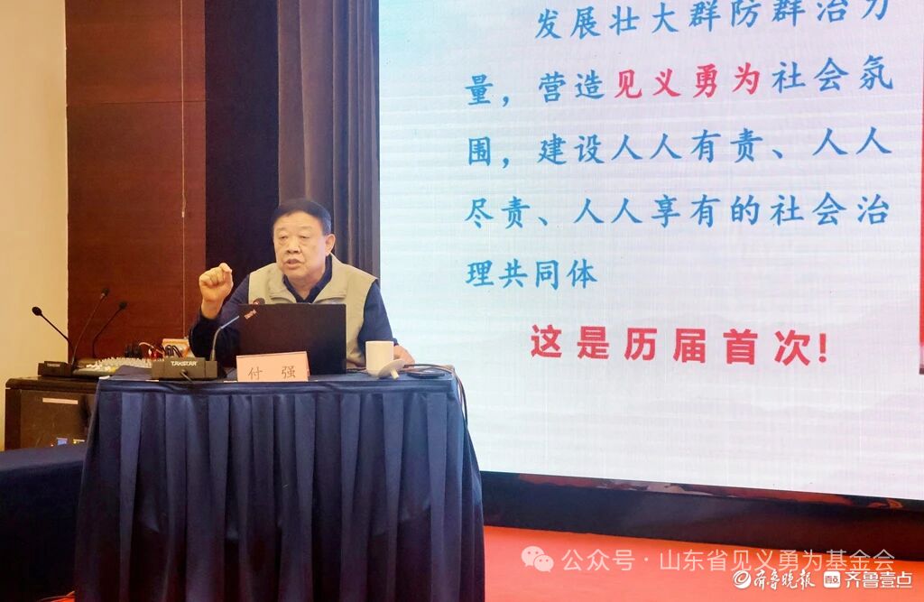 聊城市见义勇为基金会理事长付强应邀参加会议并以《弘扬见义勇为精神 助力风险防范化解》为题,深入解读了见义勇为工作的重大意义和有关政策,从什么是见义勇为、为什么要弘扬见义勇为精神、怎么做好见义勇为工作等方面进行了专题讲座。
