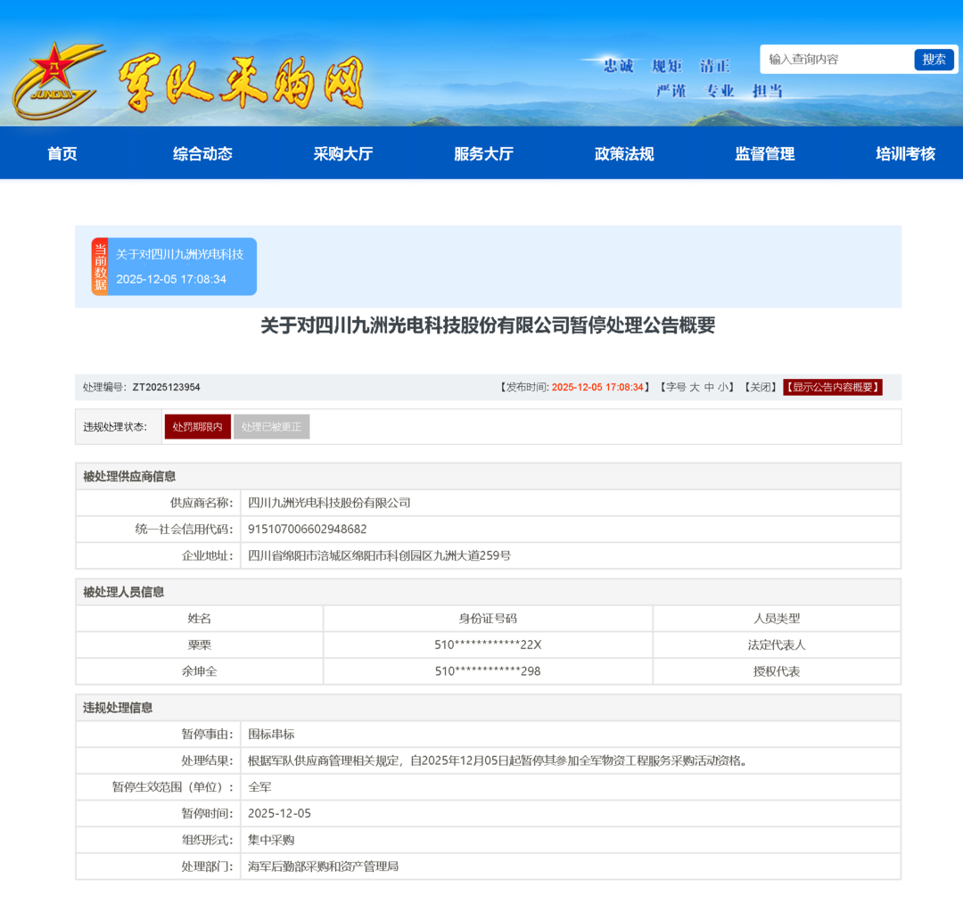 近日,军队采购网发布关于对四川九洲光电科技股份有限公司暂停处理公告。