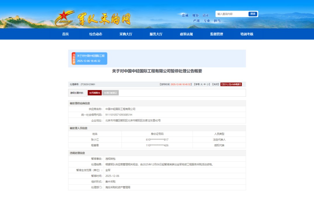 据暂停公告显示,中国中轻国际工程有限公司(统一社会信用代码:91110105710930851H)在参与军队物资工程服务采购活动中,存在“违规转包”行为。为严肃军队采购纪律,确保采购活动的公平、公正和诚信,维护军队利益和采购市场健康秩序,根据《军队物资工程服务采购管理规定》等相关法规制度,海后采购和资产管理局决定,自2025年12月06日起,暂停中国中轻国际工程有限公司参加全军范围内(暂停生效范围:全军)所有物资、工程、服务采购活动的资格。此次暂停处理的组织形式为集中采购。此次处理涉及的相关人员包括:法定代表人张小江和授权代表程春雪。