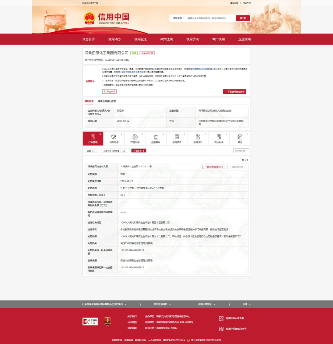 齐鲁晚报·齐鲁壹点记者于信用中国行政处罚栏获悉,11月27日,河北田原化工集团有限公司(下称“河北田原化工集团”)收到罚单,处罚机关为保定市曲阳县应急管理局(地震局)。
