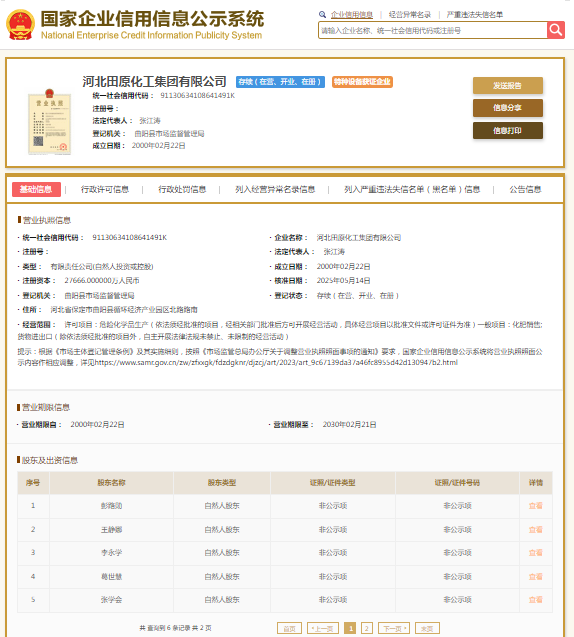 国家企业信用信息公示系统显示,河北田原化工集团有限公司成立于2000年,注册资本27666万元人民币,法定代表人张江涛。