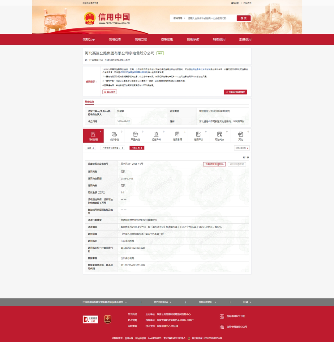 齐鲁晚报·齐鲁壹点记者于信用中国行政处罚栏获悉,12月3日,河北高速公路集团有限公司京哈北线分公司(下称“河北高速京哈北线分公司”)收到3万元罚单,处罚机关为玉田县水利局。