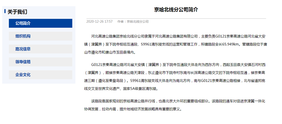 京哈北线分公司隶属于河北高速公路集团有限公司,主要负责G0121京秦高速公路河北省大安镇(津冀界)至下院寺枢纽互通段、S9961清东陵支线的运营和管理工作,所辖路段全长65.949km。管辖路段位于唐山市遵化市和唐山市玉田县境内。