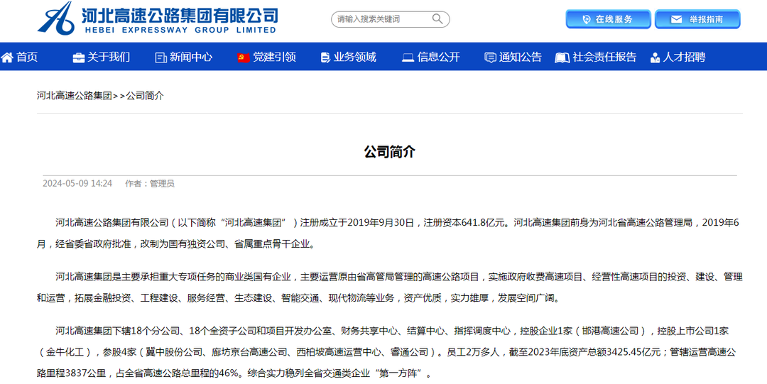 据其母公司——河北高速官网介绍,公司是主要承担重大专项任务的商业类国有企业,主要运营原由省高管局管理的高速公路项目,实施政府收费高速项目、经营性高速项目的投资、建设、管理和运营,拓展金融投资、工程建设、服务经营、生态建设、智能交通、现代物流等业务。