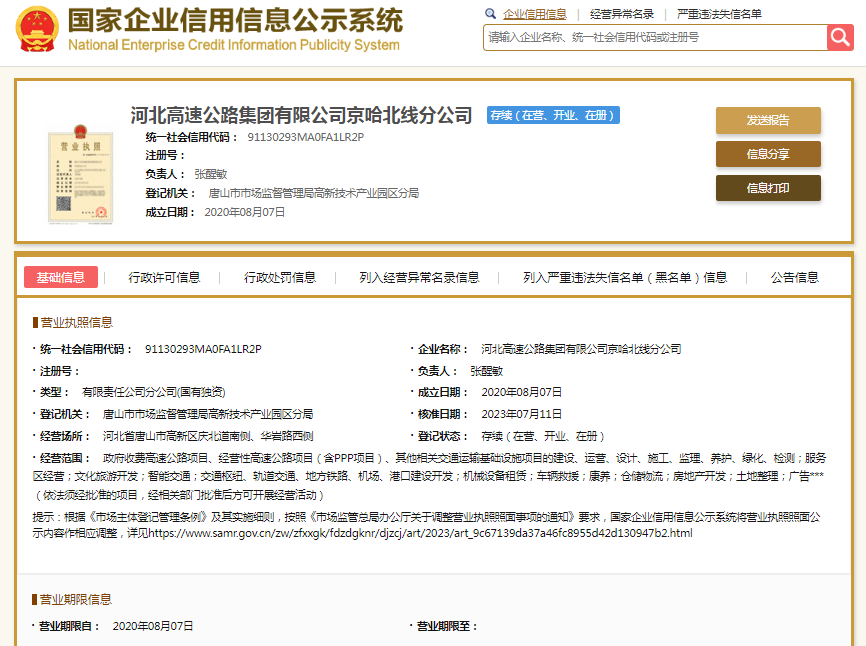 国家企业信用信息公示系统显示,河北高速公路集团有限公司京哈北线分公司成立于2020年,负责人张醒敏。河北高速公路集团有限公司则成立于2019年,注册资本6417583.05万元人民币,法定代表人张建公。