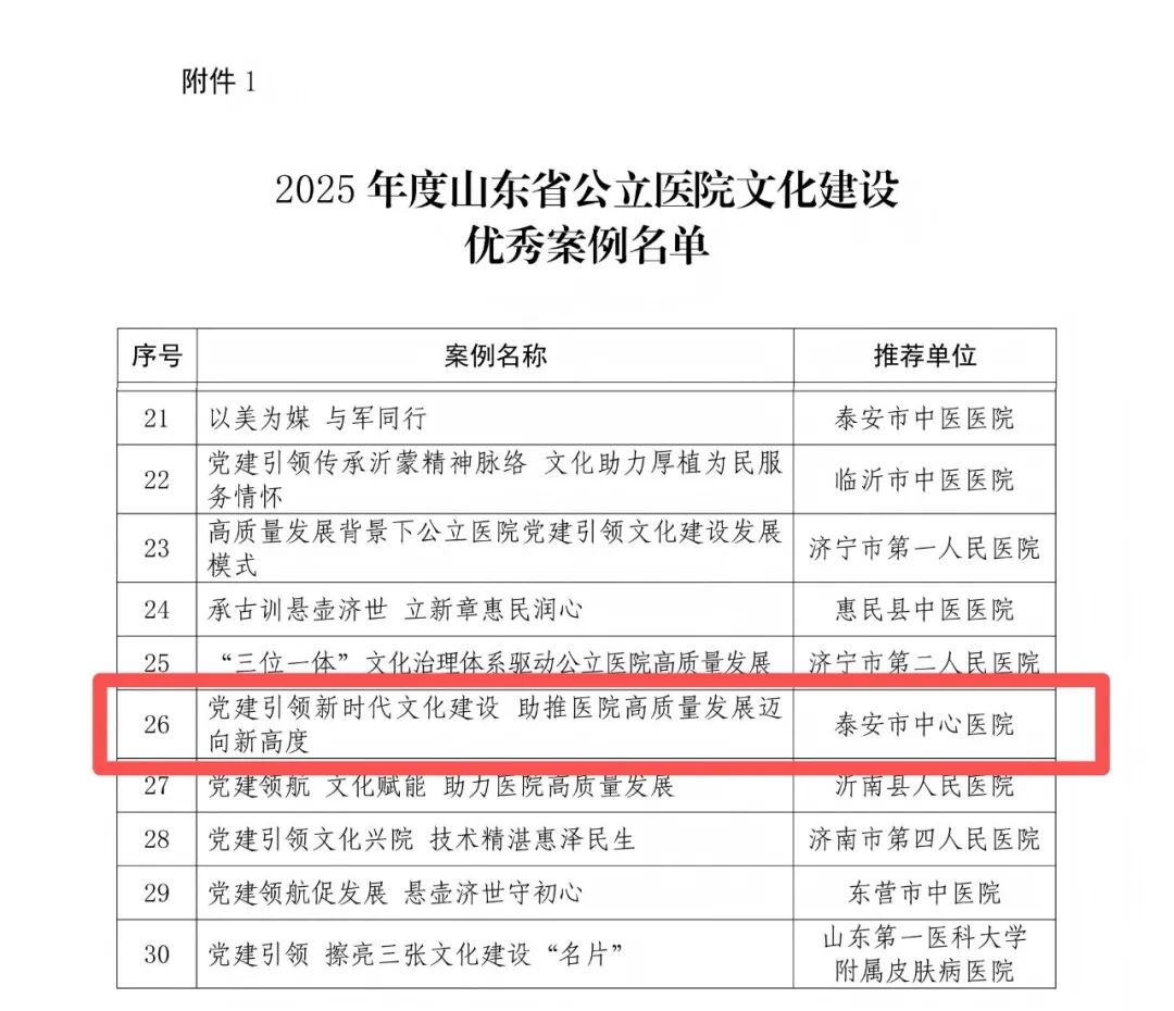 近日,山东省卫生健康委员会公布2025年山东省公立医院文化建设优秀案例评选结果,泰安市中心医院文化宣传中心报送的《党建引领新时代文化建设助推医院高质量发展迈向新高度》案例,凭借体系化构建的恢宏布局和创新性实践的亮眼成效,从众多参评案例中脱颖而出,成功入选 30 篇优秀案例之列,再次彰显了医院文化建设的显著成就。