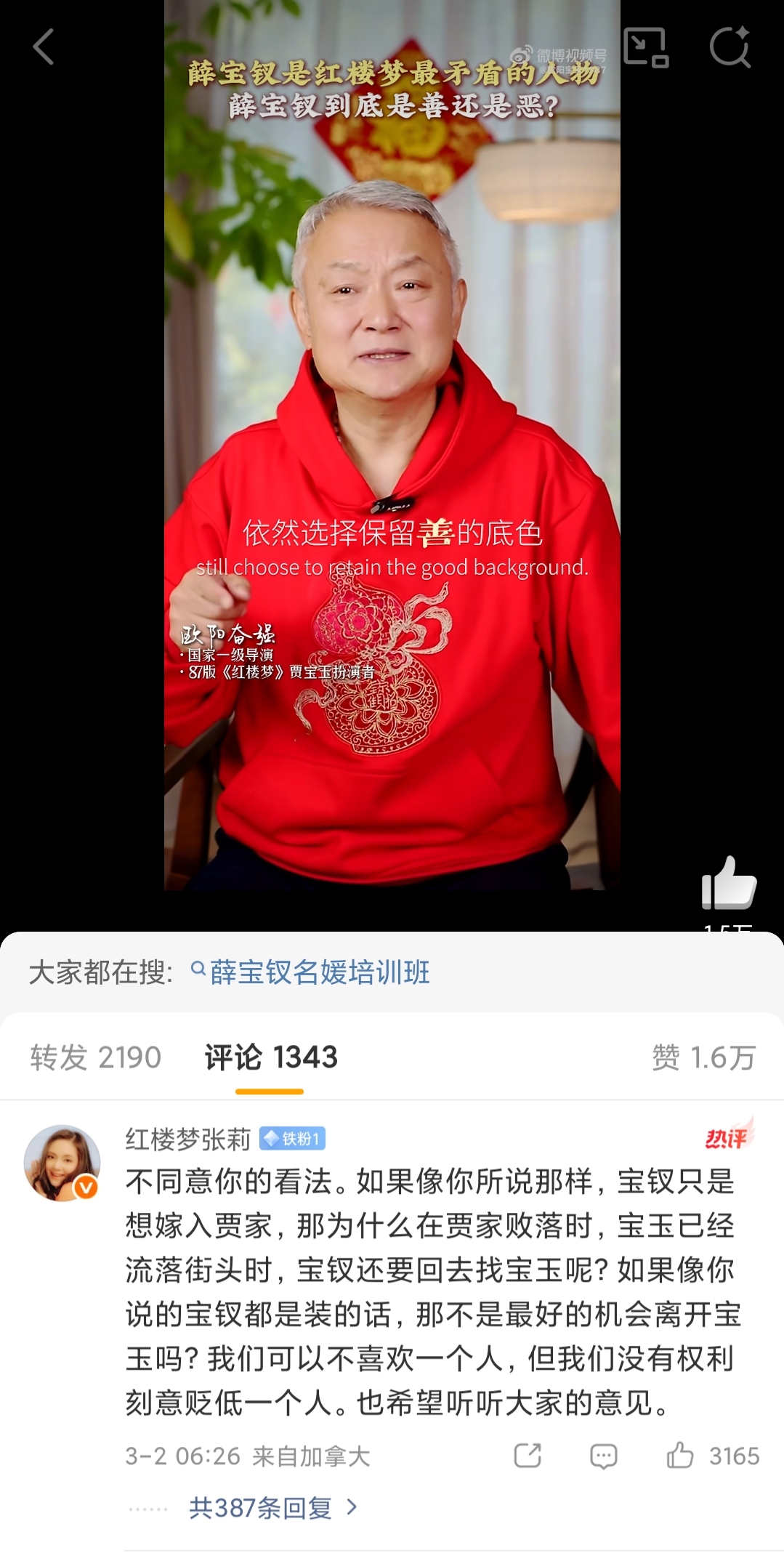 “薛宝钗‘装’到最后,没有真心,没有真意,没有真情。这样的婚姻,终究是一个悲剧。”日前,87版《红楼梦》贾宝玉扮演者欧阳奋强在社交平台用“装”字概括薛宝钗,引发热议。随后,薛宝钗扮演者张莉评论回应,“不同意你的看法。如果像你所说,宝钗只是想加入贾家,那为什么在贾家败落时,宝玉已经流落街头时,宝钗还要回去找宝玉呢?我们可以不喜欢一个人,但我们没有权利刻意贬低一个人。”一来一往间,“钗黛之争”再次跃入公众视野。