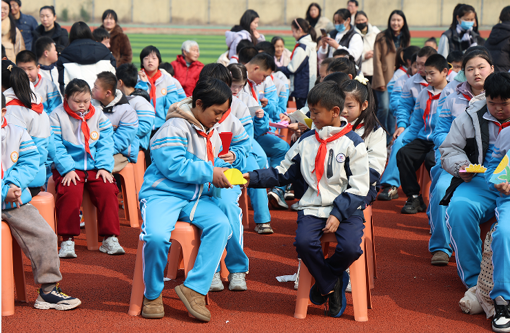 参观结束后,全体师生移步至学校操场,开启“友谊联结”破冰活动。来自两所学校的孩子们自由结对,在轻松欢快的氛围中结识了彼此的小伙伴。随后,大家共同参与了“抢板凳”“齐头并进”“你抛我接”等趣味小游戏,游戏的过程中大家的欢声笑语、默契配合、彼此鼓励,让陌生感迅速消散,信任与友谊在一次次互动中悄然建立。